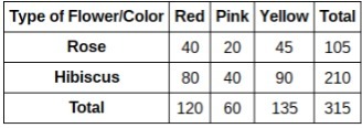 The problem's sample space consists of a selection of roses and hibiscus in various colors, totaling 315 flowers. Among these, 20 are pink roses, making the probability of selecting a pink rose 20/315, or approximately 0.063.
