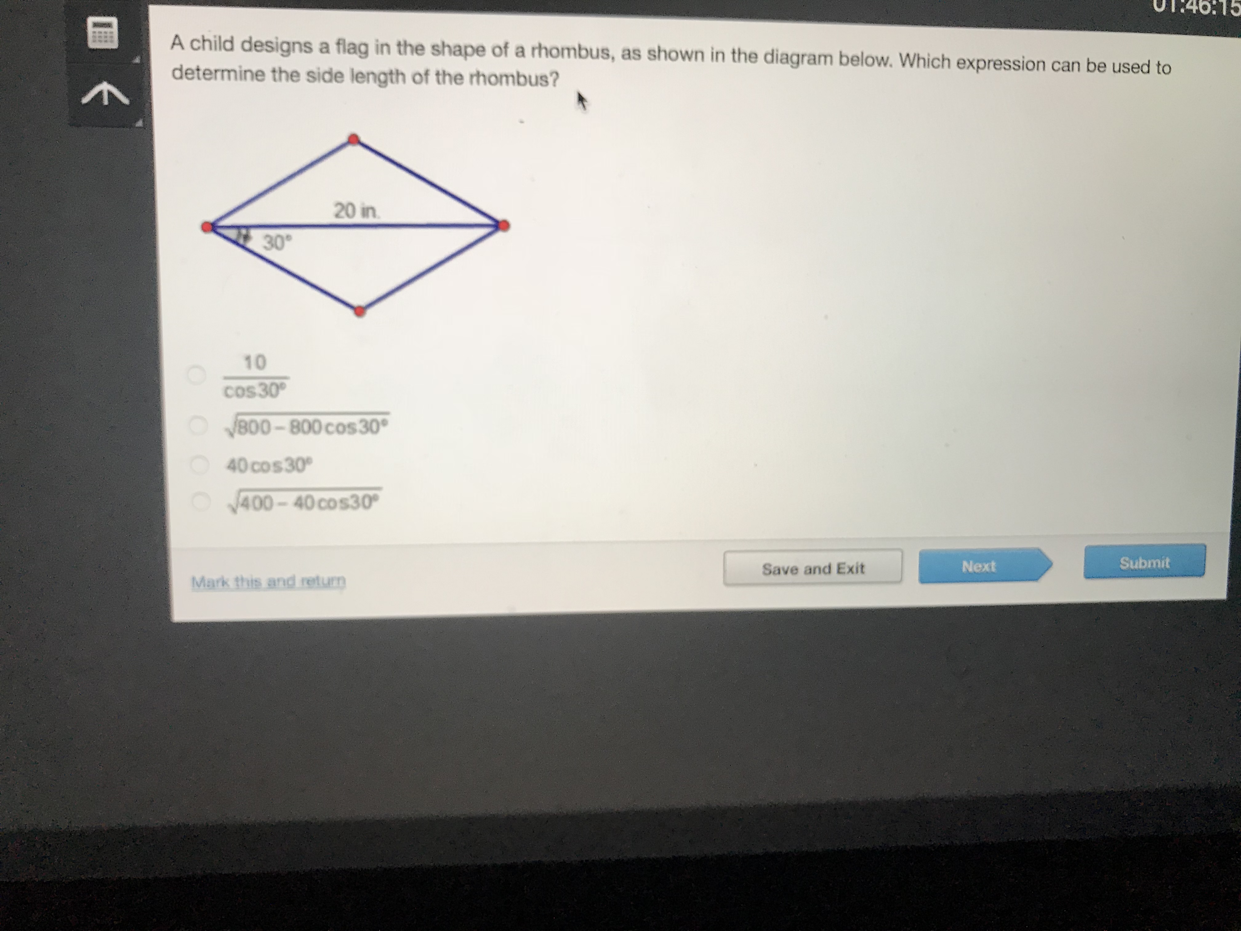 A child designs a flag in the shape of a rhombus, as shown in the diagram below. Which expression can be used to determine the s