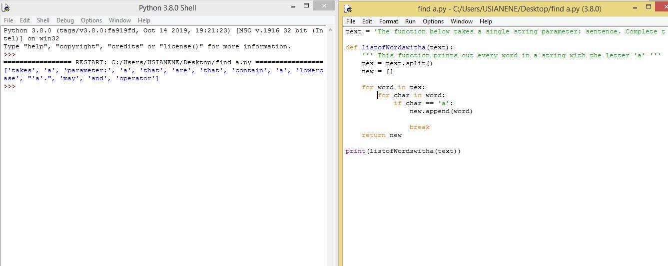 Then, use the split method to break the string into a list. In conclusion, you create a list to store all the words that contain 'a'.
