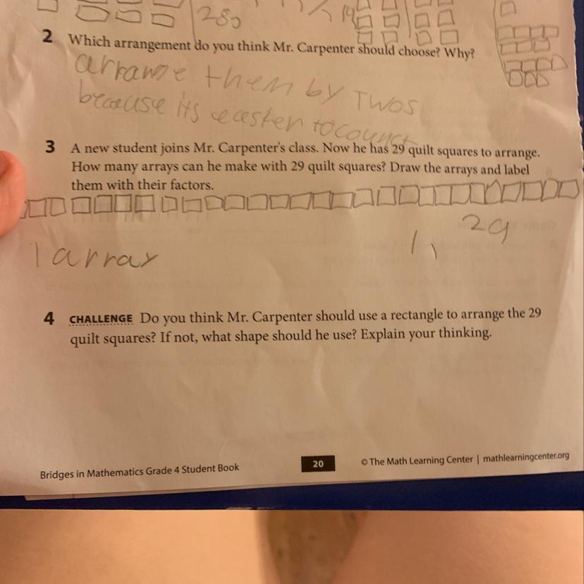 Do you think mr. carpenter should Use a rectangle to arrange the 29 quilt squares, if not, what shape should he use?