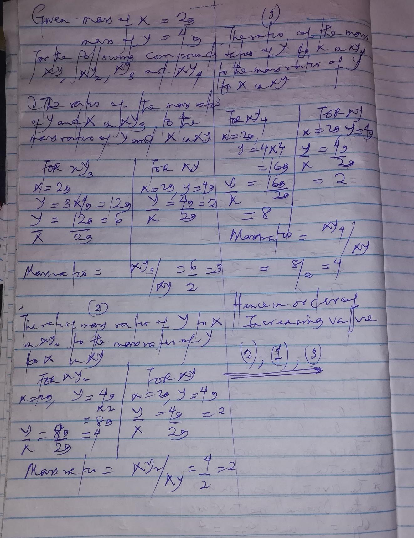The ratios arranged in ascending order are; The ratio of the mass of Y to X in XY2 divided by the mass of Y to X in XY, The ratio of the mass of Y to X in XY3 divided by the mass of Y to X in XY, The ratio of the mass of Y to X in XY4 divided by the mass of Y to X in XY