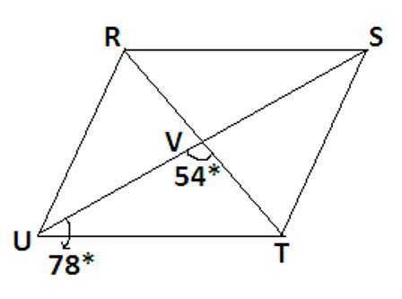 The measure of angle SRV is 48 degrees. Within the attached diagram of the parallelogram, angle TUV is 78 degrees while angle TVU is 54 degrees. By employing the triangle angle sum property for triangle TVU, we see that the total of angles TUV, TVU, and angle UTV equals 180 degrees. Thus, solving for angle UTV, we find it also measures 48 degrees because angles UTV and SRV are congruent due to the parallel lines and transversal.