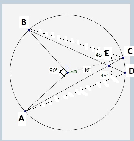 m∠AOB = 90° ⇒ m∠ADB = 45°