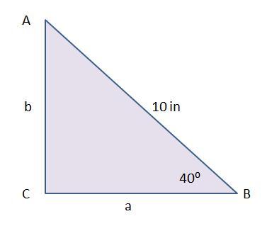 A B C is 40 degrees. The length of hypotenuse A B is 10 inches, the length of A C is b, and the length of C B is a. (10)sin(40o) = AC (10)cos(40o) = AC StartFraction 10 Over sine (40 degrees) EndFraction = AC StartFraction 10 Over cosine (40 degrees) EndFraction = AC