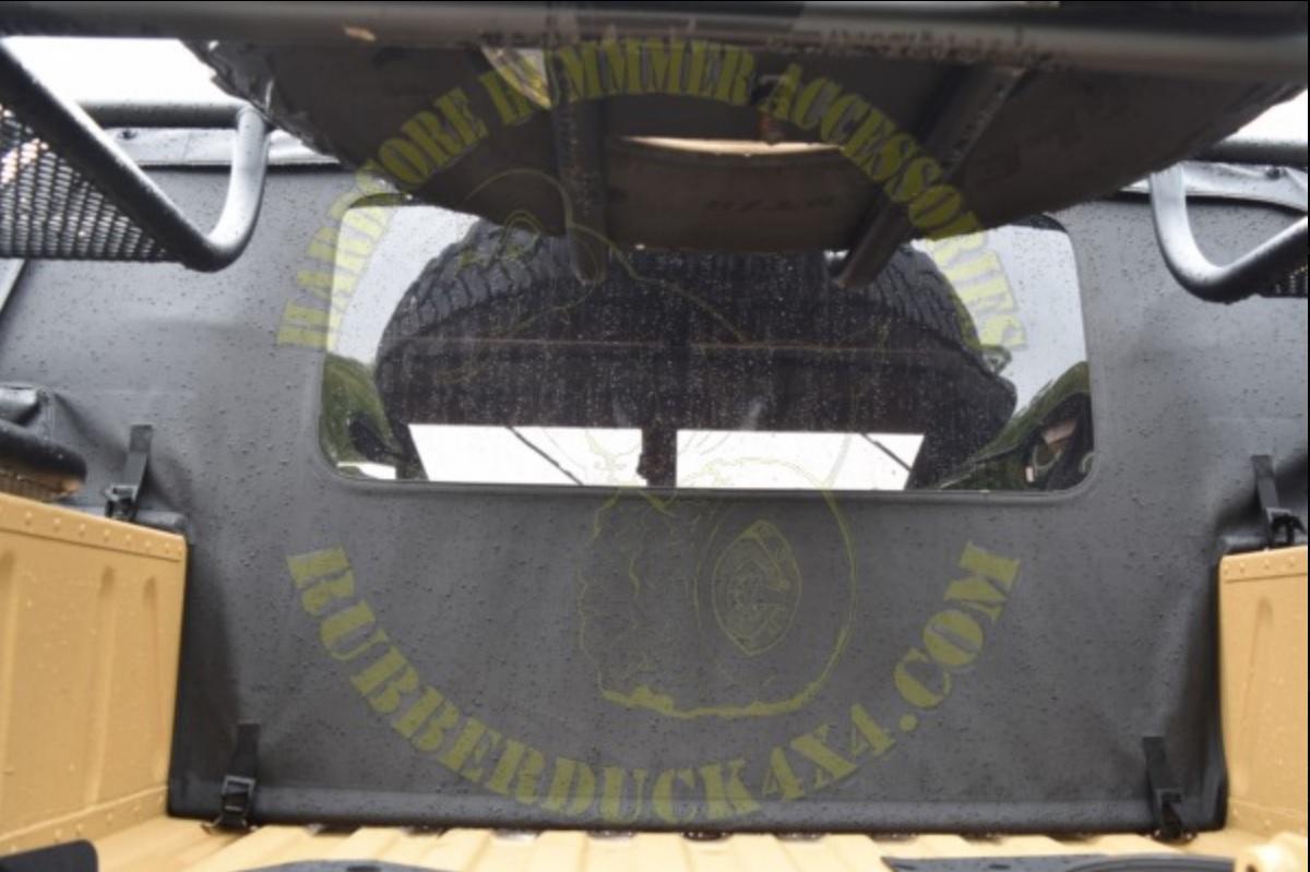 The canvas cargo covers for HMMWV trucks are attached to the vehicle by threading through gaps and securely fastened with adjustable straps at the rear of the vehicle. The corresponding image is provided above. These straps ensure that the soft top is tightly secured for an aesthetically pleasing finish and allow for hassle-free installation and removal as needed.