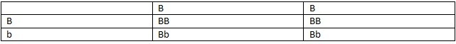 Assuming the black fur allele is B and the white fur allele is b, breeding a homozygous black rabbit with a heterozygous black rabbit will lead to the outcomes shown in the punnet square below;