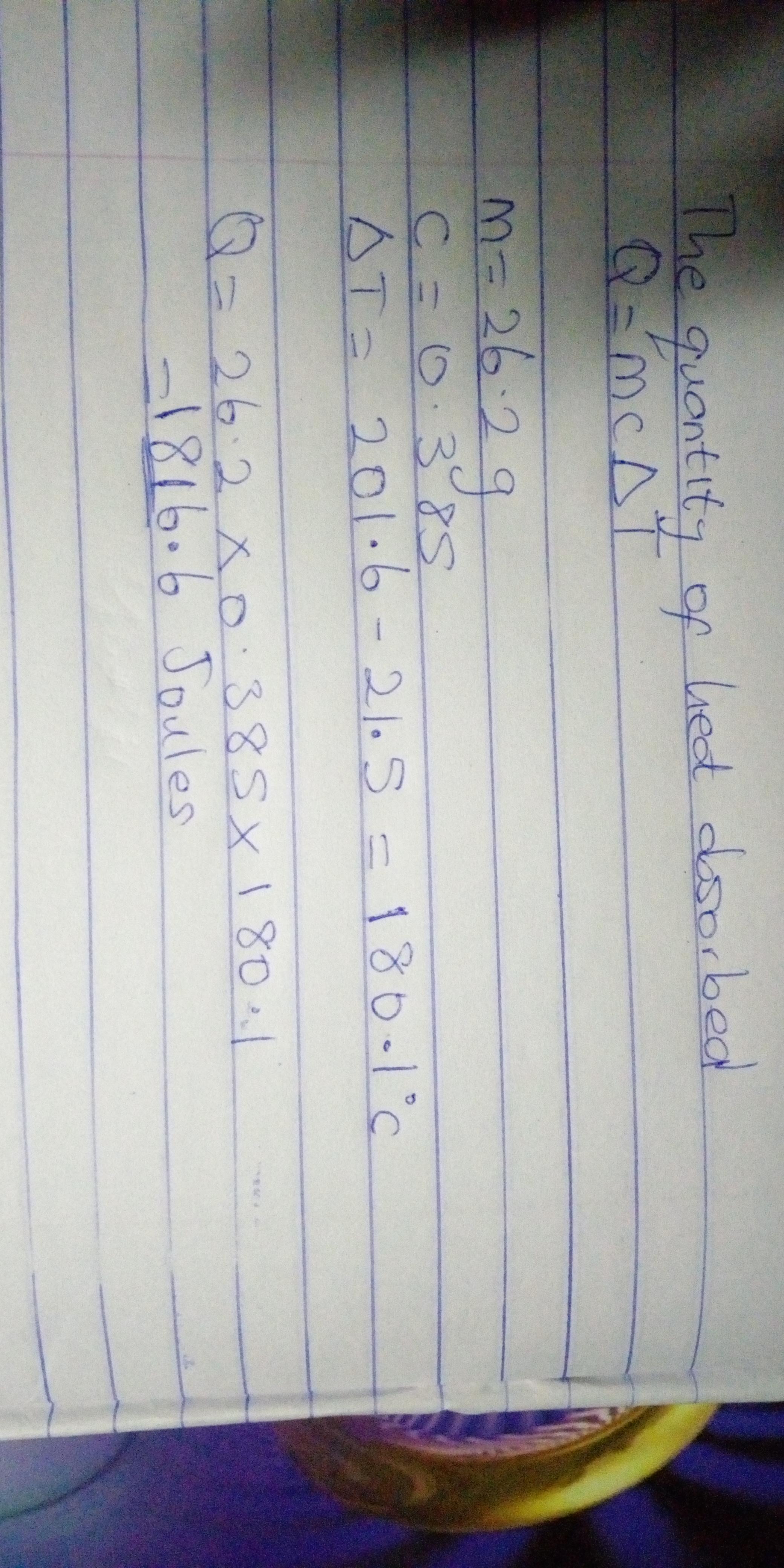 26.2 g piece of copper metal is heated from 21.5°C to 201.6°C. Calculate the amount of heat absorbed by the metal. The specific