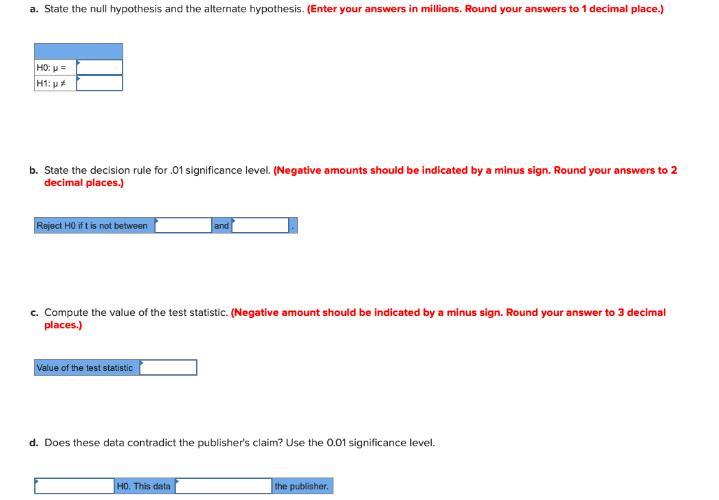 The detailed calculations are outlined beneath: To ascertain each section, the following calculations are necessary: Critical t-value = 3.250. Null hypothesis: 1.5, Alternative hypothesis: ≠ 1.5, Population mean = 1.5, Sample mean = 1.30, Sample size = 10.00, Sample standard deviation = 0.900. The standard error of the mean computes to 0.2846. The test statistic results in -0.703. The null hypothesis claims μ = 1.5. Contrarily, the alternate hypothesis asserts μ ≠ 1.5. One should reject the hypothesis if t lies outside -3.250 to 3.250. The statistic's value is t = -0.703; thus, we fail to reject it, as the data doesn’t oppose the publisher's claim.