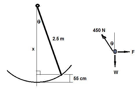 Referencing the diagram below, we can deduce from the geometry that x = 2.5 - 0.55 = 1.95 m, leading to cos θ = 1.95/2.5 = 0.78. Therefore, θ = cos⁻¹ 0.78 = 38.74°. According to the free body diagram, the tension in the chain measures 450 N. Here, F denotes the centripetal force and W signifies Dee's weight. The tension's components are as follows: Horizontal component = 450 sin(38.74°) = 281.6 N, directed to the left, and Vertical component = 450 cos(38.74°) = 351.0 N, directed upward. Answers: Horizontal: 281.6, directed left. Vertical: 351.0 N, directed upward.