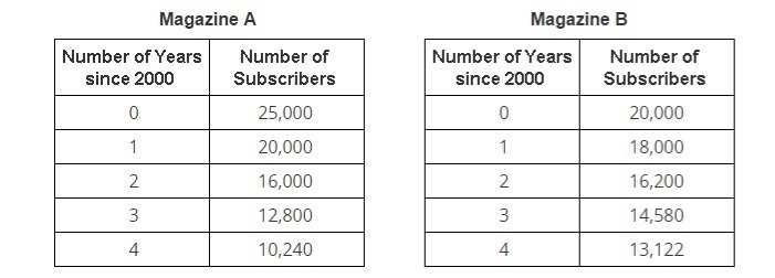 Which of the following describes the number of subscribers represented by the tables? Only the number of subscribers to magazine B is increasing. , The numbers of subscribers to both magazines are increasing. , The number of subscribers to both magazines are decreasing. , or Only the number of subscribers to magazine B is decreasing.