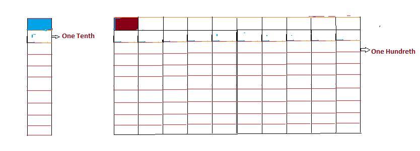For shading one tenth, you would shade only 1 out of 10 rectangles, while for one hundredth, you would shade 1 out of 100 rectangles. The corresponding image is provided below.