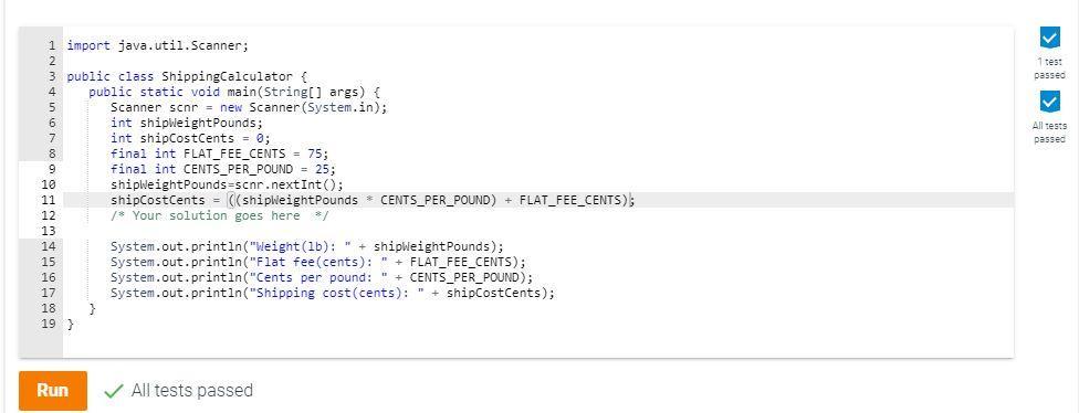 POUND and initialize with 25.2. Get the shipping weight from user input storing the weight into shipWeightPounds.3. Using FLAT_FEE_CENTS and CENTS_PER_POUND constants, assign shipCostCents with the cost of shipping a package weighing shipWeightPounds.import java.util.Scanner;public class ShippingCalculator { public static void main (String [] args) { Scanner scnr = new Scanner(System.in); int shipWeightPounds; int shipCostCents = 0; final int FLAT_FEE_CENTS = 75;int CENTS_PER_POUND = 25;shipWeightPounds=10;shipCostCents = (shipWeightPounds * CENTS_PER_POUND) + FLAT_FEE_CENTS; System.out.println("Weight(lb): " + shipWeightPounds); System.out.println("Flat fee(cents): " + FLAT_FEE_CENTS); System.out.println("Cents per pound: " + CENTS_PER_POUND); System.out.println("Shipping cost(cents): " + shipCostCents); }}