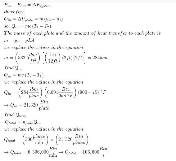 initially at a uniform temperature of 75°F are heated by passing them through an oven at 1500°F at a rate of 340 per minute. If the plates remain in the oven until their average temperature rises to 900°F, determine the rate of heat transfer to the plates in the furnace.