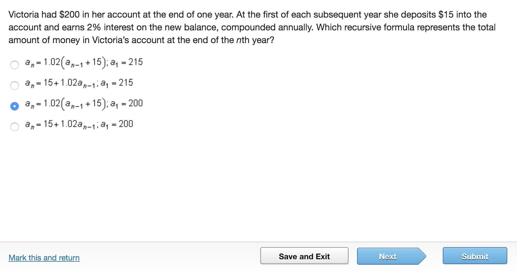 The initial amount is 200 and because there’s an annual deposit of $15, we have P = 200 + 15t