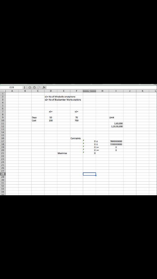 y has a well-established position on the phone market, but has recently decided to conquer the PC market with its new product - Blackamber workstation. YPlum has very ambitious plans and is determined to become a significant player in the computer market, while maintaining its strong position in the smartphone area.Your task is to find a product mix that would maximize yPlum's profits in the next month. Since you always had interest in accounting and financial analysis, you have quickly identified the relevant information. On average, it costs the company $250 to manufacture the Mirabelle phone, and $700 to produce the Blackamber. The products are being sold for $650 and $1200 respectively. After exchanging emails with your supply chain group, you have established that the phone requires 50 days of labor, while the laptop - 70 days. The computers take longer to produce because the customers can build their own setups. Your total manufacturing capacity is 160,000 working days. Your annual materials budget is set at $12,000,000. Finally, the company's executives expect that yPlum will sell at least 1 million phones and 0.5 million computers next month.Find the optimal mix of product quantity that would maximize yPlum profits. Submit the Excel file with your solution.