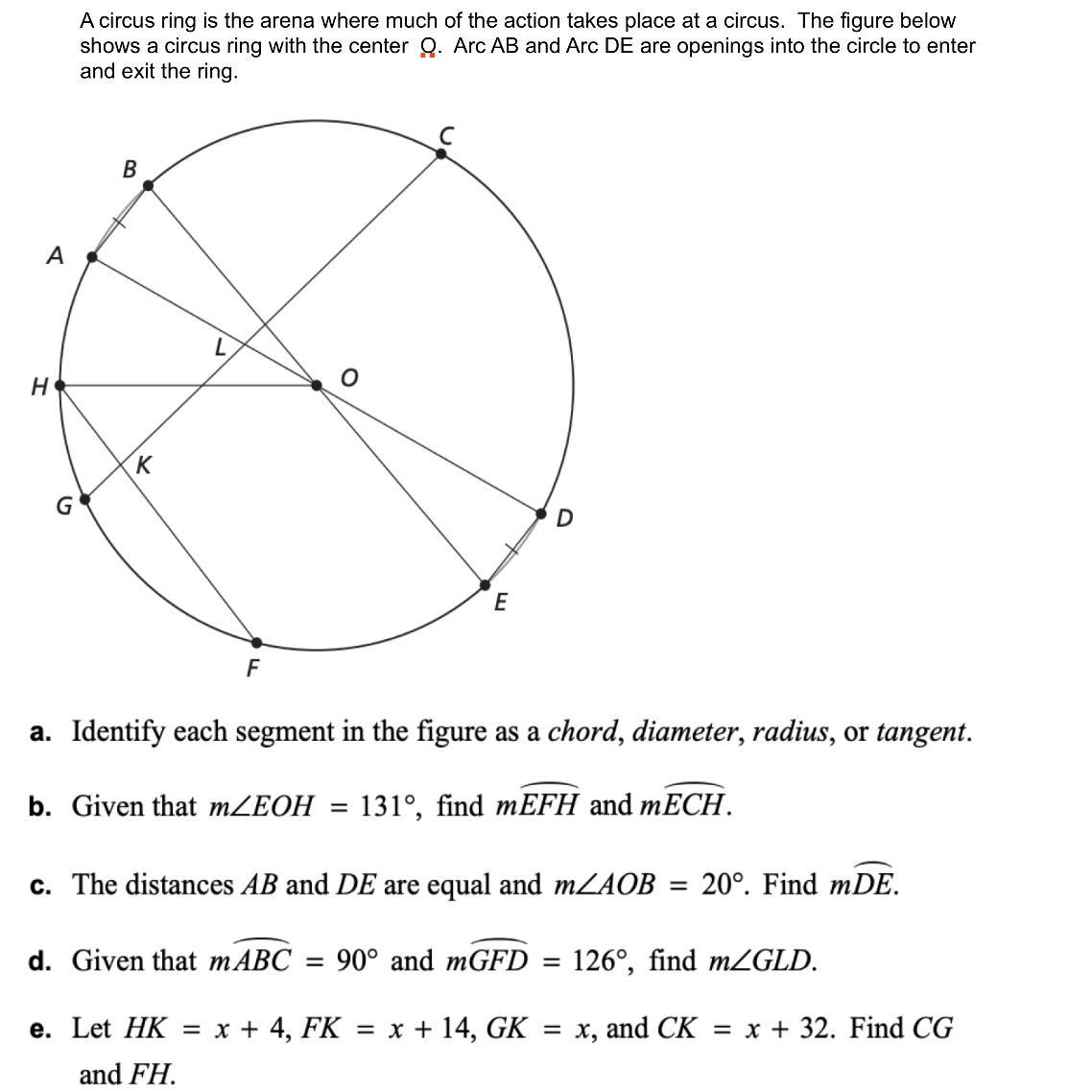 A chord connects two points on the circumference of a circle but does not come through the center; it traverses segments of the circle instead. For instance, line FH is a chord