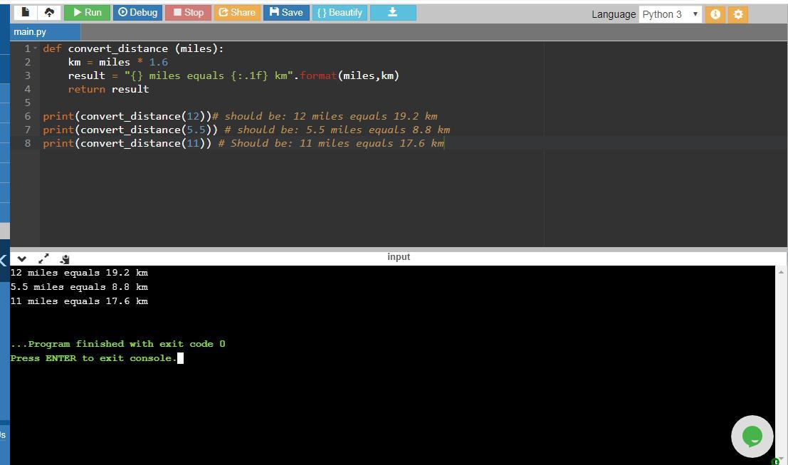 print(convert_distance(12))# expected output: 12 miles equals 19.2 km