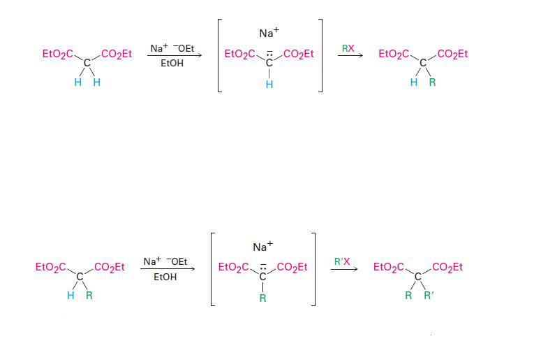 Diethyl malonate possesses greater acidity compared to monocarbonyl substances (pKa=13) because its alpha hydrogens are linked to two carbonyl groups. Consequently, the malonic ester can be readily changed into its enolate ion by reacting it with sodium ethoxide in ethanol. When the malonic ester undergoes alkylation, a hydrogen atom in the alpha position becomes acidic, permitting another round of alkylation to yield a dialkylated malonic ester.
