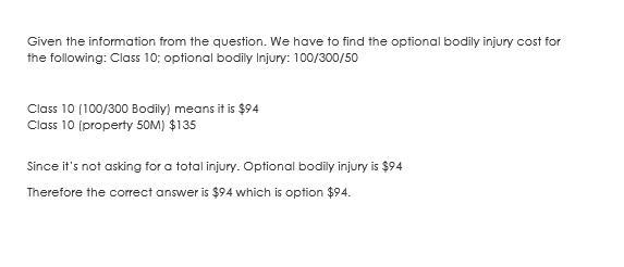For Class 10 (100/300 Bodily), the cost is $94, and for Class 10 (property 50M), it's $135. It's solely asking for the optional bodily injury cost, which amounts to $94.