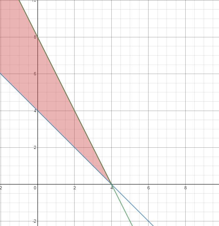 The green line corresponds to 2x+y≤8, while the blue line represents x+y≥4