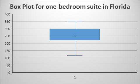 The average charge for a one-bedroom suite aligns with the median, also $253, indicating that the typical daily rate for the suite was $253. With a mean of $253, we can deduce that most daily charges are clustered near this median, thus causing the box and whisker plot to lean towards the right side (upper side), as 50% of the daily rates already surpass $253 with the median at $253.