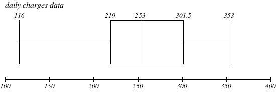 The median equals $253, while the lower quartile is $219 and the upper quartile is 301.5, these figures illustrate that 75% of the daily charges for the suite were around $219. The Box and Whisker Graph demonstrates that for the majority of the days, the charges exceeded $219, leading to a longer lower whisker compared to the upper whisker.