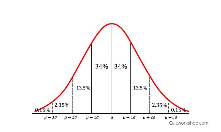 In contrast, the likelihood within 2 standard deviations from the mean is (13.5% + 34% + 34% + 13.5%) = 95%