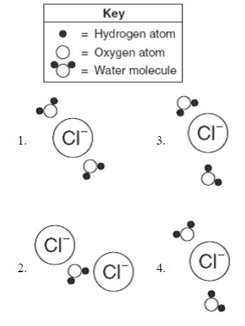 There are four representations depicting the arrangement of water molecules surrounding a chloride anion. Let's commence with the analysis of the water molecule.