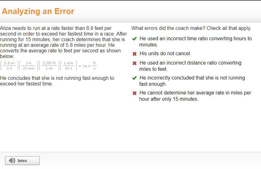 minutes, her coach determines that she is running at an average rate of 5.8 miles per hour. He converts the average rate to feet per second as shown below: