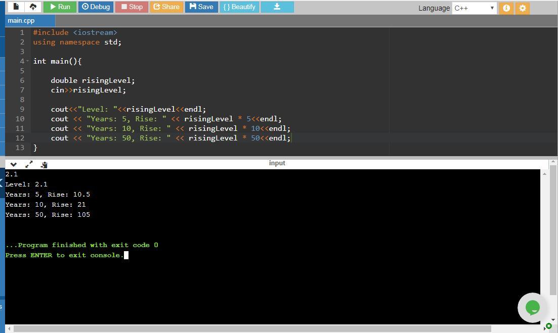 cout << "Years: 10, Rise: " << risingLevel * 10<<endl; //outputs the increase in ocean level over 10 years