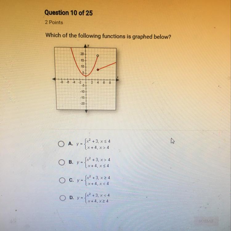 This function is piece-wise, meaning you will have two equations along with distinct domains. The equation x squared plus 3 illustrates a parabolic curve, while x plus 4 is depicted as a linear function. There is a specific reason why the point on the parabola is open at x equals 4; this signifies that the value does not satisfy the equation. Therefore, x cannot equal 4 for the parabola, so its domain is x less than 4. The closed point on the linear function indicates that when x is 4, it is part of the solution for that equation and graph. Consequently, the domain for the linear function is x greater than or equal to 4. Hope this clarifies things!