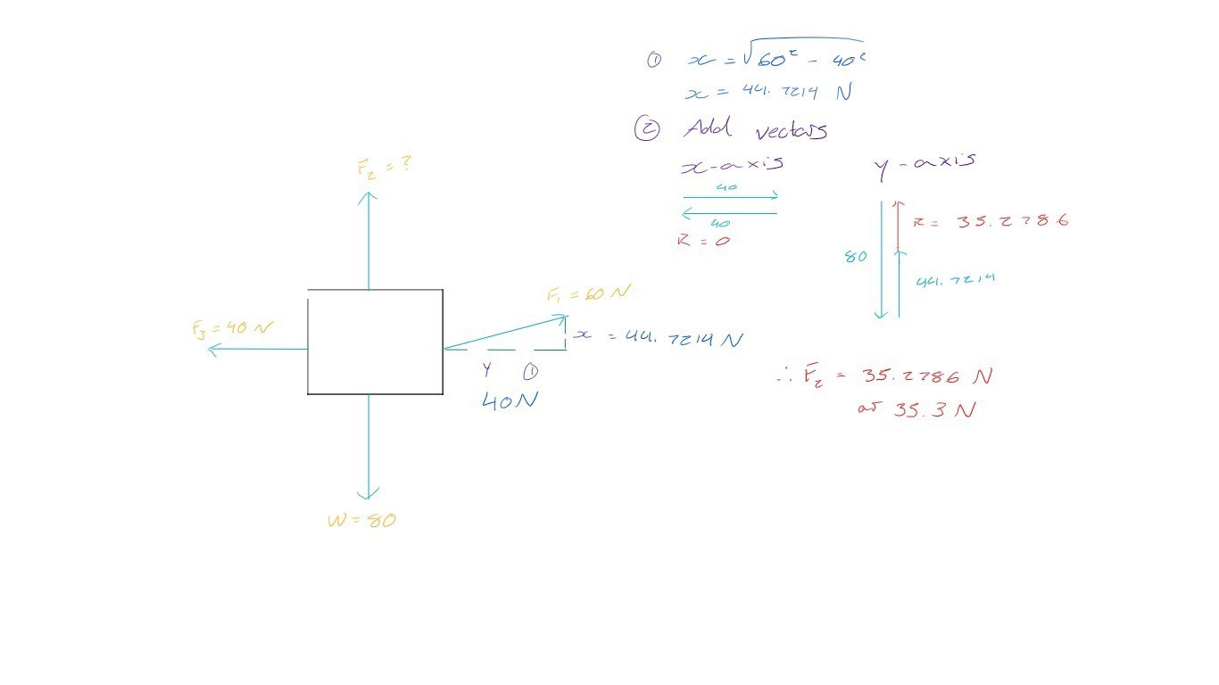 In static equilibrium, all forces balance out. Therefore, to simplify, start by breaking down F1 into its horizontal and vertical components. Since no other forces act horizontally, F1's horizontal component is known to be 40N. This information can be used to determine the vertical component using the Pythagorean theorem. Once the components are established, simply add the vertical components to calculate the difference between the upward and downward forces.