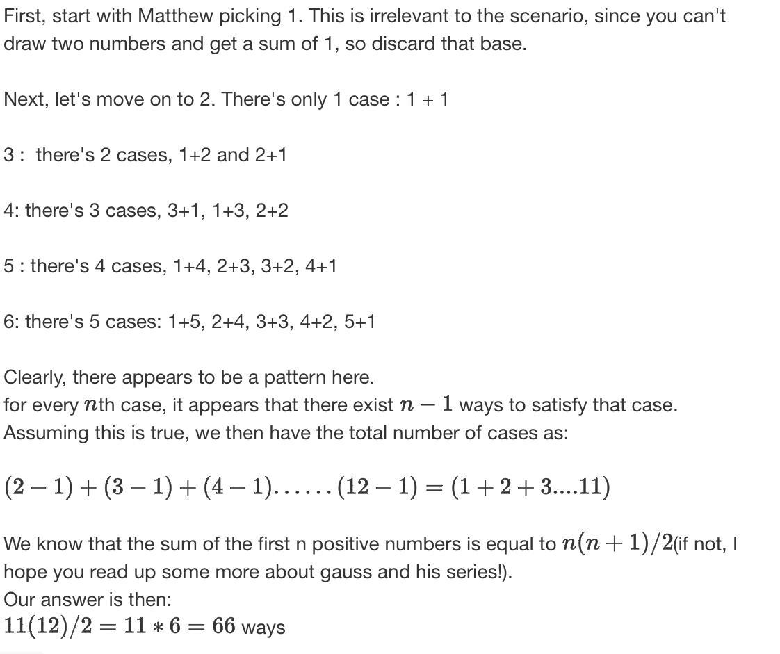 rble from his bag and I choose two from mine. In how many ways can we choose the marbles (where the order of my choices does matter) such that the sum of the numbers on my marbles equals the number on his?