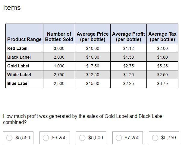 The sum of profits from gold label and black label sales amounts to \boxed{{\mathbf{\$5750}}}. Here's the breakdown: From the provided data, calculate gold label profit as {\text{profit earned by gold label}}={\text{ number of bottles sold }}\times{\text{ average profit}} based on the number of bottles sold and average profit per unit. Similarly, calculate black label profit using the 2000 bottles sold and average profit {\text{profit earned by black label}}={\text{ number of bottles sold }}\times{\text{ average profit}}. Adding these profits gives \begin{aligned}{\text{combined profit}}&={\text{profit earned by black label}}+{\text{profit earned by gold label}}\\&=\$3000+\$2750\\&=\$5750\\\end{aligned}, concluding that the total combined profit is \$5750, which matches option five \boxed{{\mathbf{\$5750}}}. Further relevant resources are linked for deeper understanding. This explanation is suited for middle school math covering profit and loss concepts, involving keywords such as profit, sales, combined totals, and average calculations.