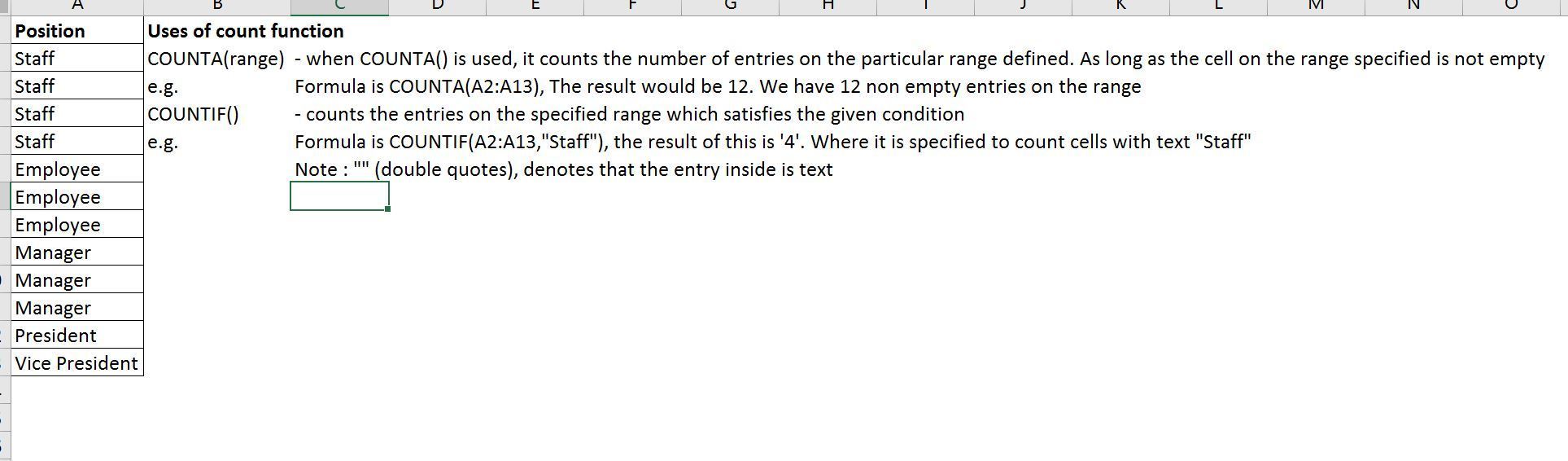 Utilization of count function 1.0 COUNTA(range) - The COUNTA() function counts the number of non-empty entries within a defined range. For example, using the formula COUNTA(A2:A13), the result will be 12 as there are 12 non-empty entries in that range
