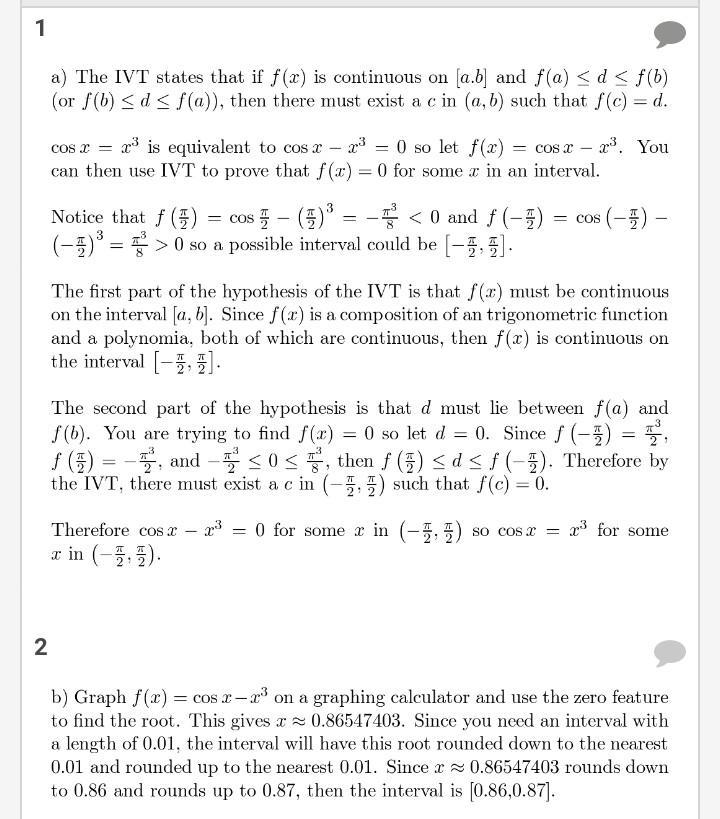 Consider the following equation. cos x = x3 (a) Prove that the equation has at least one real root. f(x) = cos x − x3 is continu
