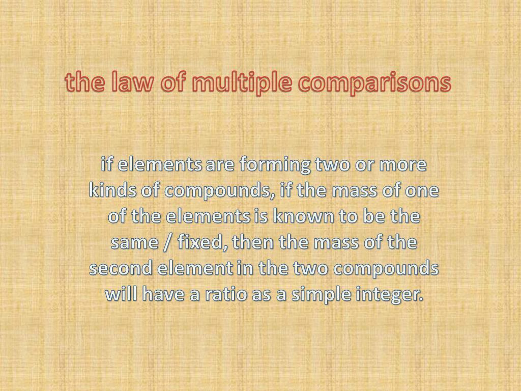 According to the law of multiple proportions, also referred to as Dalton's Law, when two elements form compounds, the mass ratios of the second element that combine with a specific mass of the first yield small whole number ratios.
