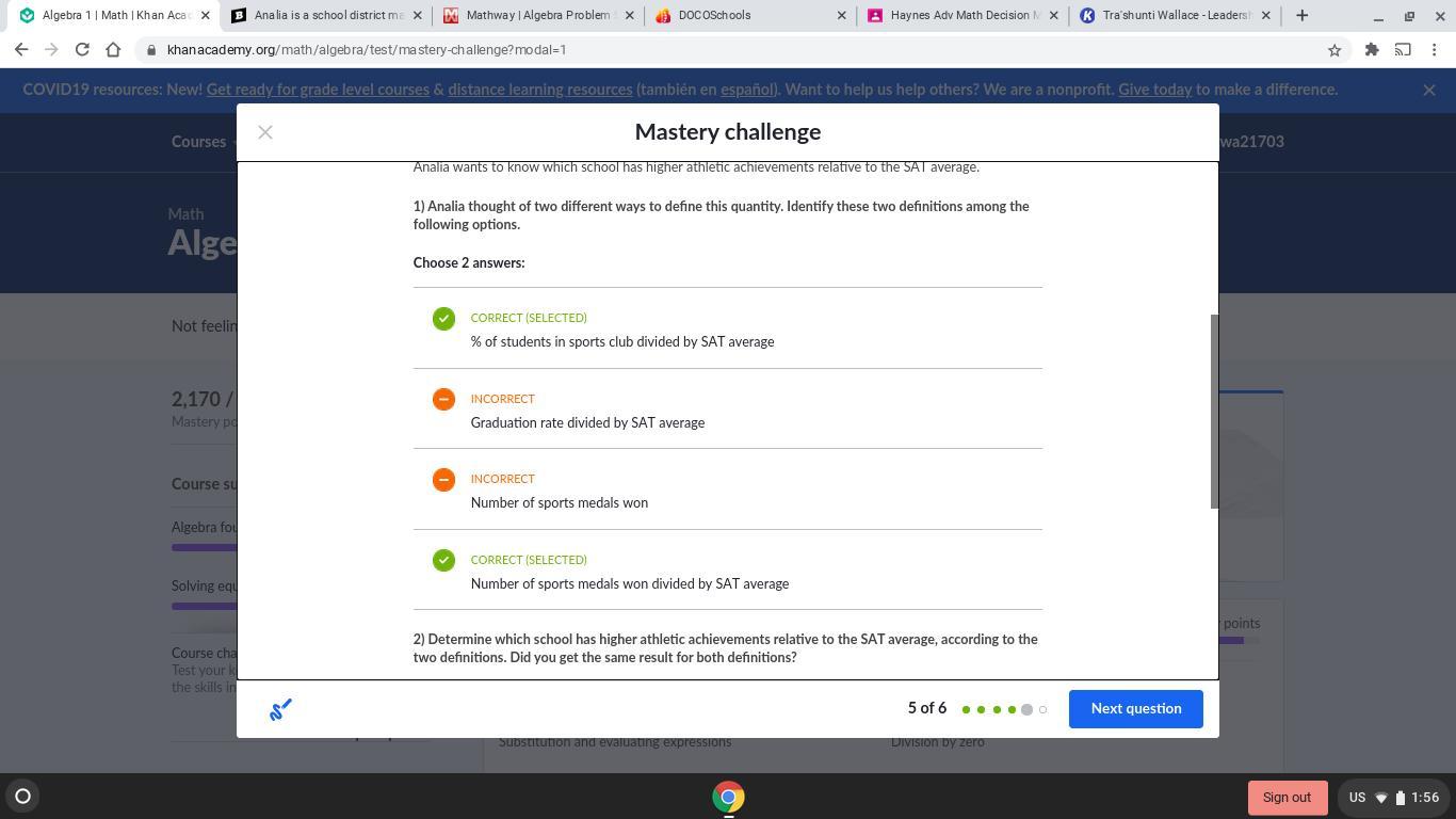 School B Number of students 300030003000 400040004000 Number of teachers 190190190 380380380 Graduation rate 86\%86%86, percent 90\%90%90, percent Budget per student \$10{,}500$10,500dollar sign, 10, comma, 500 \$10{,}000$10,000dollar sign, 10, comma, 000 % of students in sports club 62\%62%62, percent 68\%68%68, percent Number of sports medals won 999 777 SAT average 120012001200 105010501050 SAT range (max-min) 900900900 700700700 Analia wants to know which school has higher athletic achievements relative to the SAT average. 1) Analia thought of two different ways to define this quantity. Identify these two definitions among the following options.