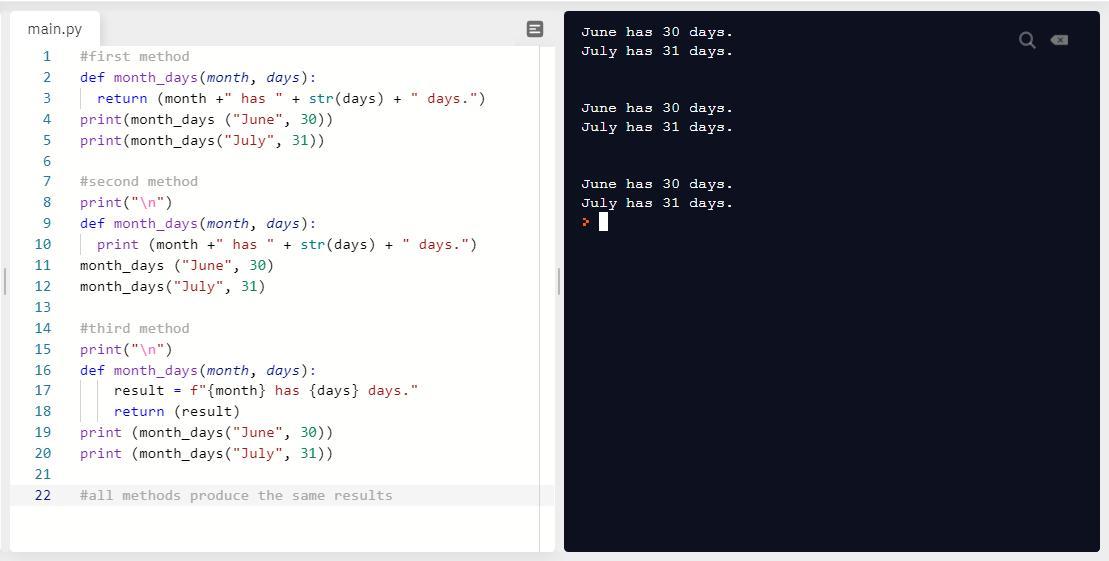This program can also be constructed using an f-string for better formatting in the month_days function: