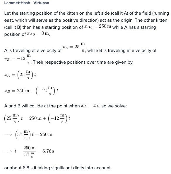 two kittens are on opposite sides of a field, 250 m apart. kitten the runs at a constant speed of 25 m/s due east on a collision