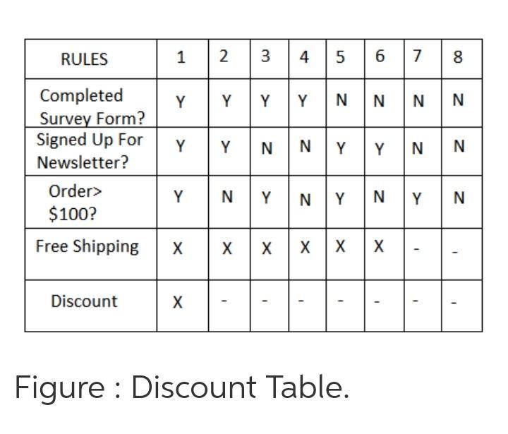 Step 1: Create a table reflecting the three potential scenarios and two possible outcomes. There should be a total of 8 distinct rules for the three varying conditions, structured similarly to the discount table shown here in the example: attached is the discount table