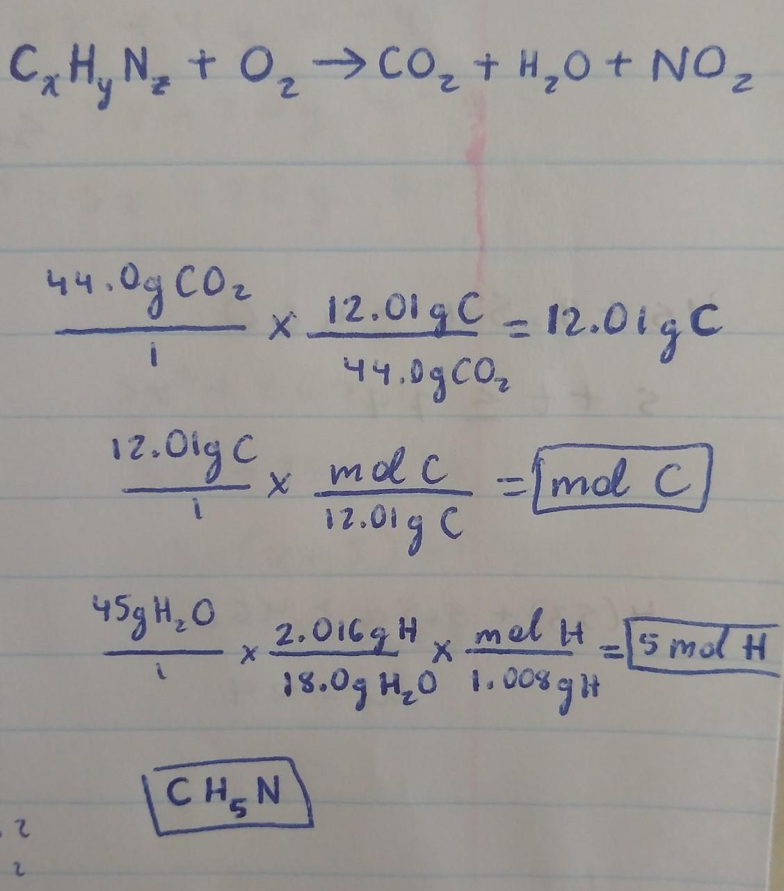 A sample of a compound that contains only the elements C, H, and N is completely burned in O2 to produce 44.0 g of CO2, 45.0 g o
