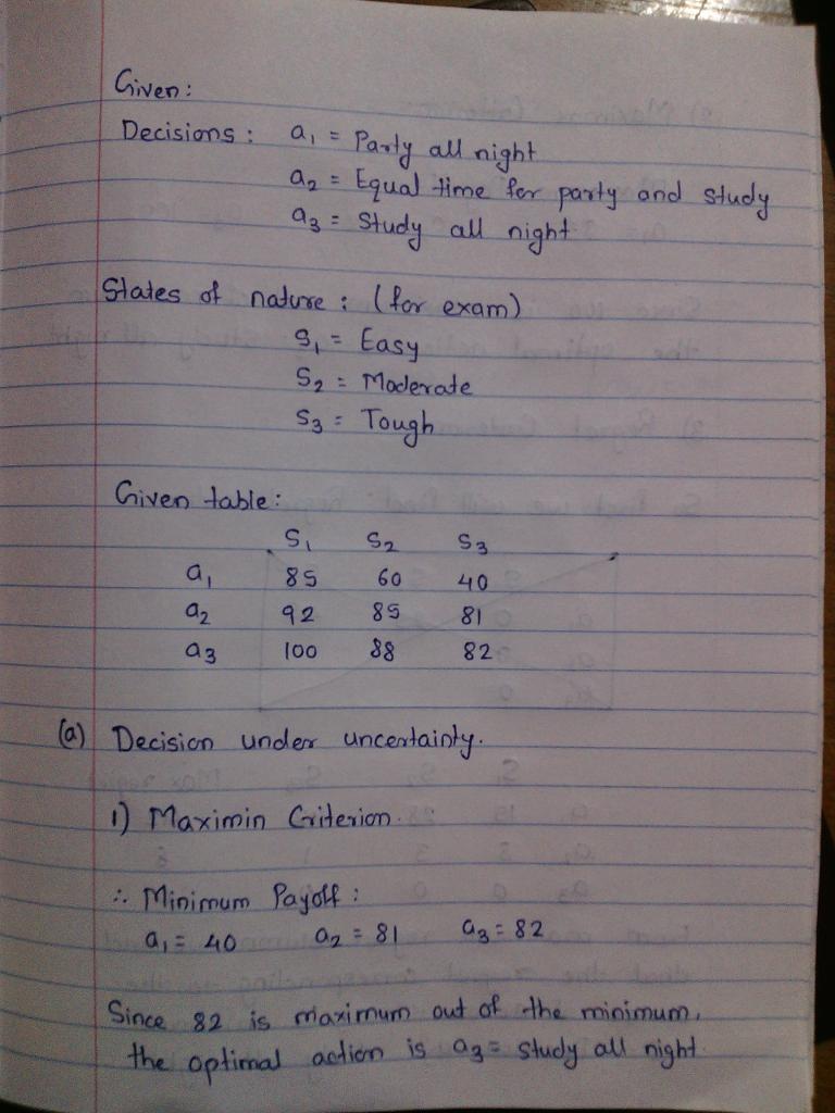 e the test. For tomorrow's test, Hank is faced with a small problem: His fraternity brothers are having an all-night party in which he would like to participate. Hank has three options: a1 - party all night: 2-divide the night equally between studying and partying: 3 - study all night. Tomorrow's exam can be easy (s1), moderate (S2) or tough (53), depending on the professor's unpredictable mood. Hank anticipates the following scores: